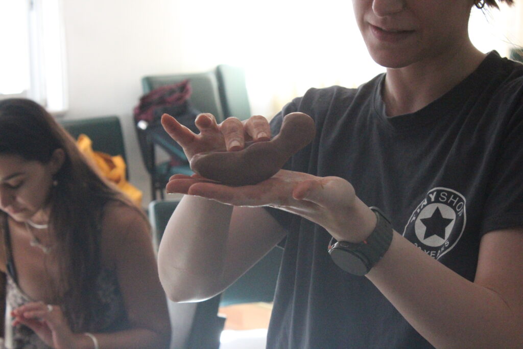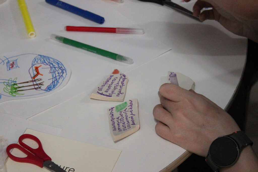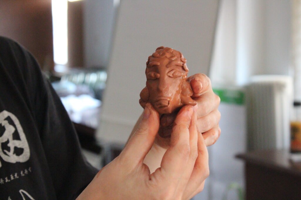 As an introduction to individual visioning, participants were instructed to write a secret, wish or description about their personal future on a small piece of paper. After they finished, they tore a handful of clay from a prepared slab, folded the paper and buried it inside. Then, they sculpted a form that related to their secret. In the end, they could share their work and give hints about how the form relates to their secret, without revealing it. Even without having previous engagement with clay, participants managed to embed deep, personal messages within their forms, resulting in a collection of unique idols.