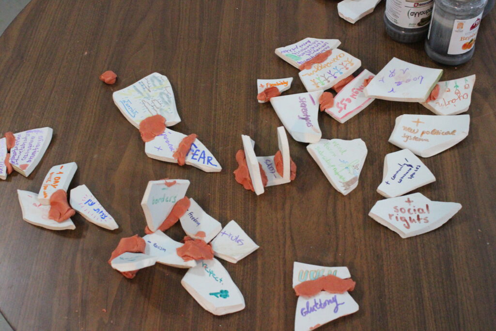 Drawing from the ancient democratic of Ostracisism (in which Ancient Athenians would vote on ceramic shards on who should be exiled from the city in order to preserve democracy), participants were instructed to inscribe on two shards of pottery what they would cull from and what they would add to our society to reach their desired future. After presenting their ideas and engaging in discussions, they found connections between these values, concepts or people, by physically connecting them with each other through soft clay. The formed miniature mosaics showed pathways towards the future, conversations held within clay form.