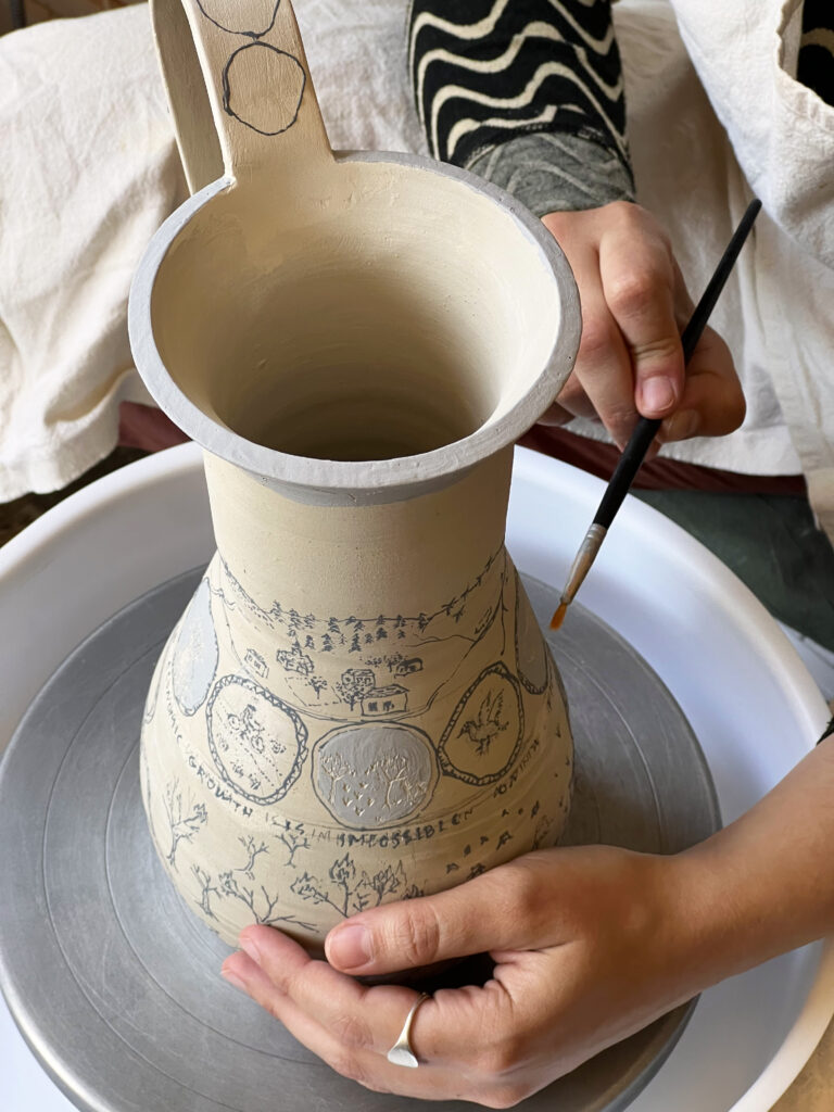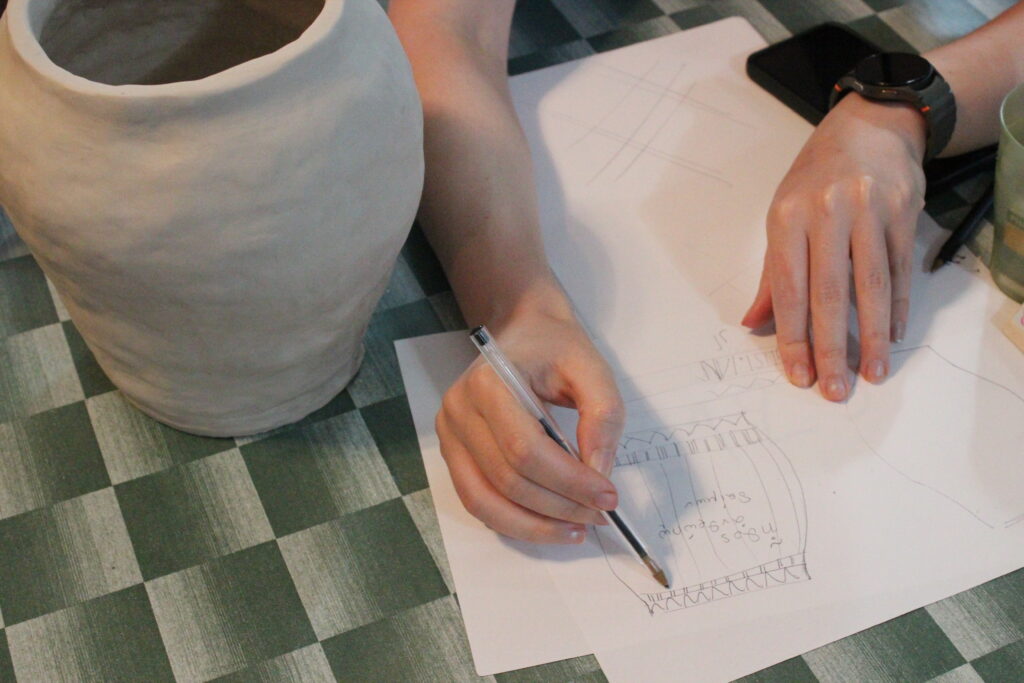 As the final exercise, participants were tasked with thinking about the desired future through transitions. They formed four groups, each representing a different moment in time: 2025 (current), 2080, 2125 and 2300. I had prepared four ceramic vessels that were bone-dry and we collectively distributed them among the groups. The participants then had to discuss and decide how they would depict their specific future by carving didactic scenes, symbols and patterns on the surface of the painted vessels. The end results are varied and explorative in terms of theme, symbology and technique.